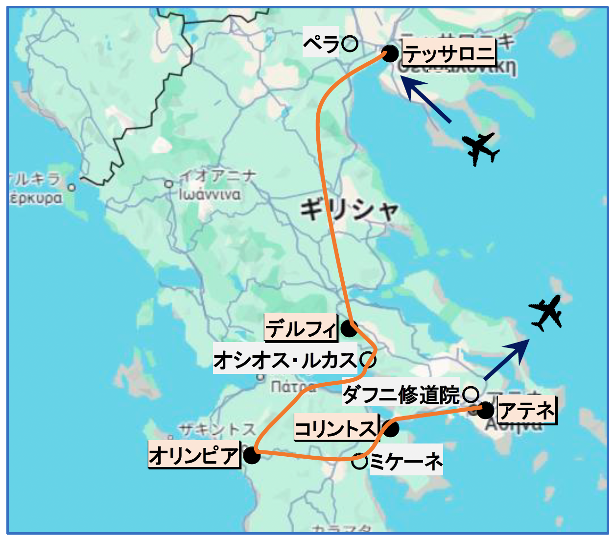 まず北辺のテッサロニキに入り、アレクサンドロス大王の考古遺跡や美術品に注目し、市内ではビザンティン時代の諸聖堂と残存するモザイクも見ておきます。そこから南下して、ギリシアの中心地デルフィ(古代のデルフォイ)で考古遺跡を訪問し、博物館では有名なブロンズの「御者の像」を見学します。